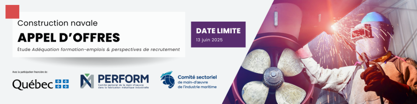 Longueuil / Québec, 20 mai 2025 – À la suite des récents investissements massifs dans la construction navale au Québec, les comités sectoriels de main-d’oeuvre (CSMO) de la fabrication métallique industrielle (PERFORM) et de l’industrie maritime (CSMOIM) annoncent le lancement conjoint d’un appel d’offres pour la réalisation d’une étude approfondie sur la main-d’oeuvre dans le secteur de la construction, de l’entretien et de la réparation navale.