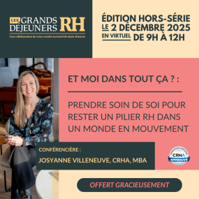 La prochaine édition des Grands Déjeuners RH se déroulera le 2 décembre 2025, en virtuel, de 9h à 12h.
